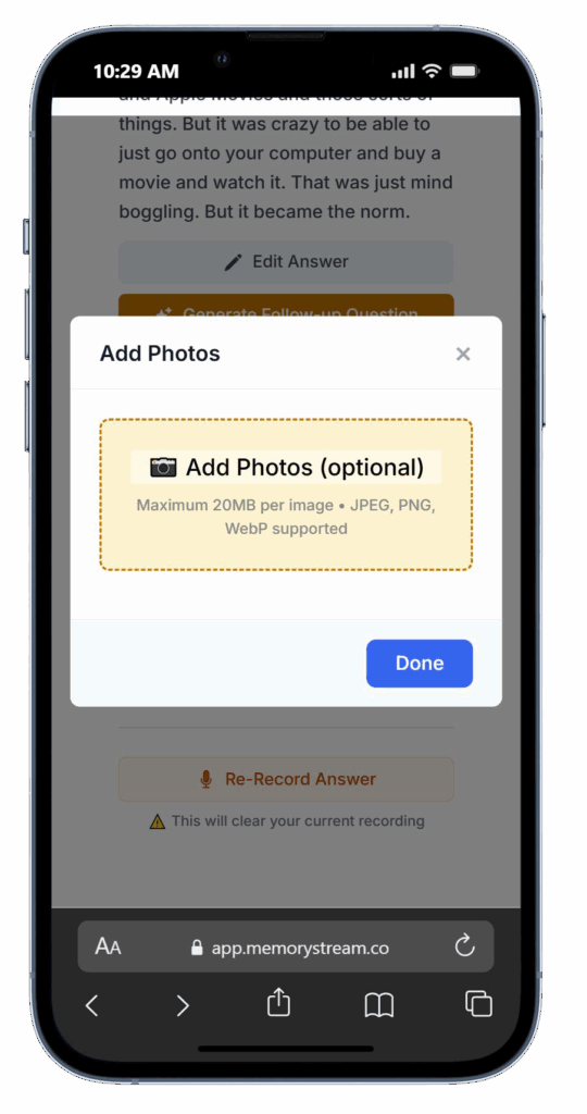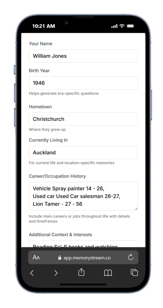 Just hit record and share your stories at your own pace. You can edit your answers anytime or listen back to what you’ve recorded. It’s all about making it comfortable and stress-free.