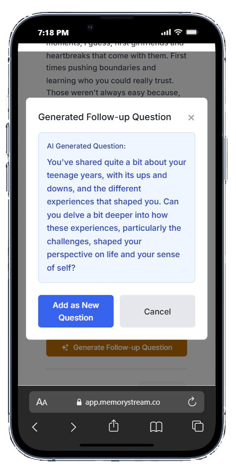 Memory Streams unique smart questions keep the conversation going. Our system reads the content you have provided and dives deeper into the topics you have mentioned, but not covered fully.